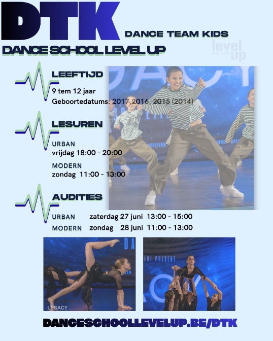 Vanaf 9 jaar kunnen dansers terecht bij onze DTK Teams: Dance Team Kids Modern en/of Dance Team Kids Urban.